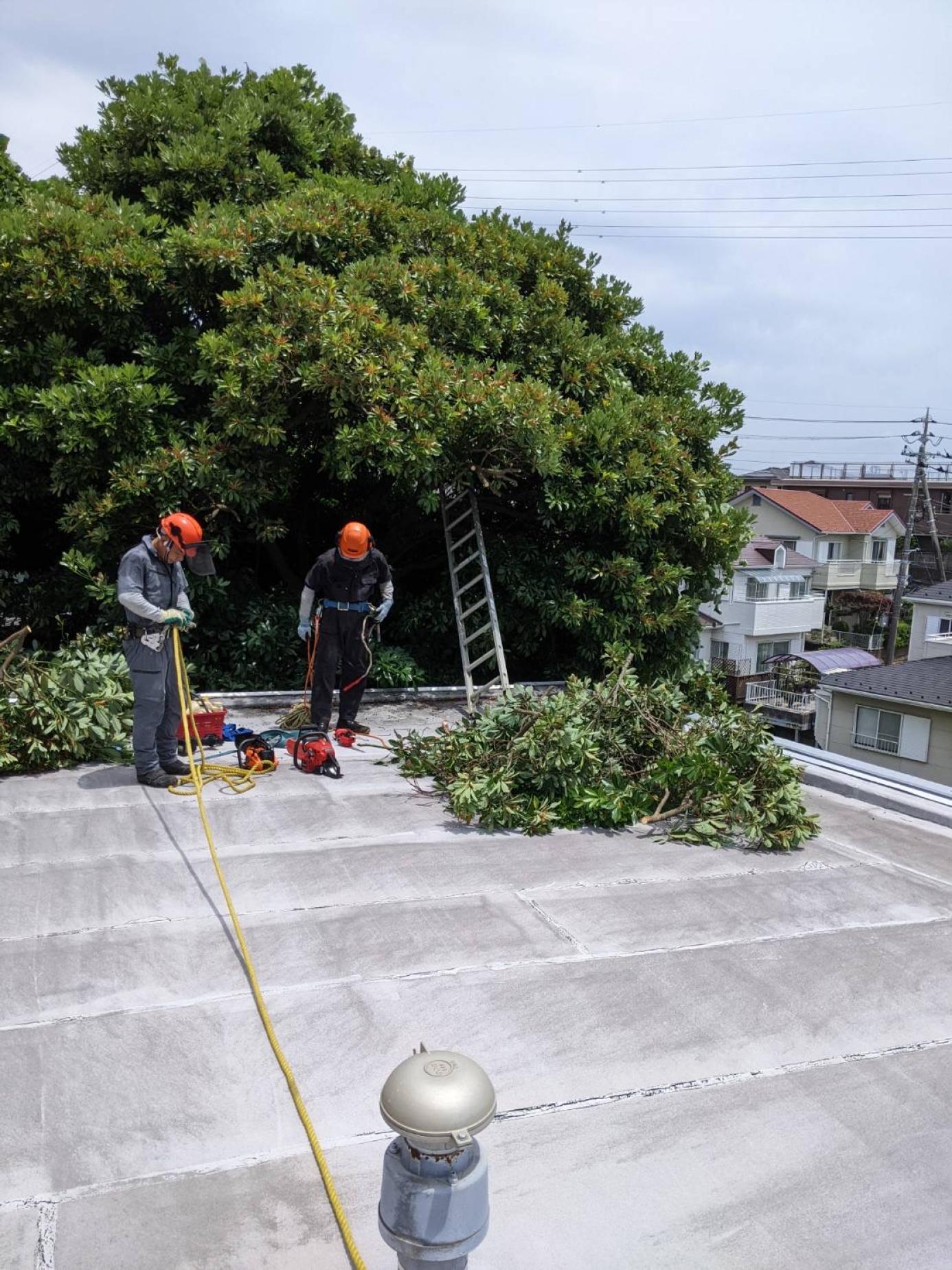 15メーター以上あるような大きな木ですが、マンションの壁にもたれかかっているので、屋上からハシゴを伸ばして高いところに一気に登れて助かりました😃